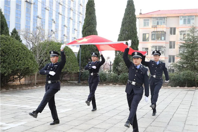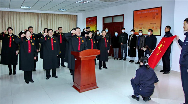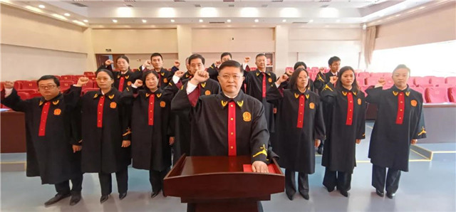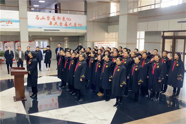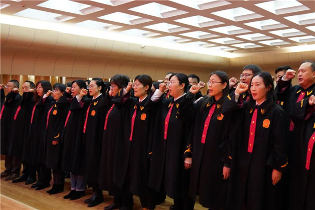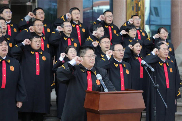 “我宣誓:忠于中华人民共和国宪法......”黄明春手抚《中华人民共和国宪法》,带领威海中院全体员额法官,面向国旗,举起右拳,庄严宣誓。