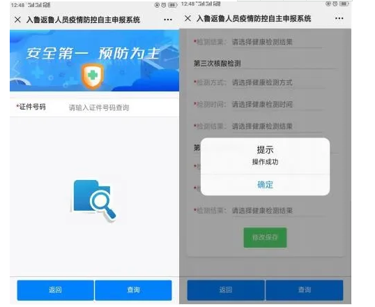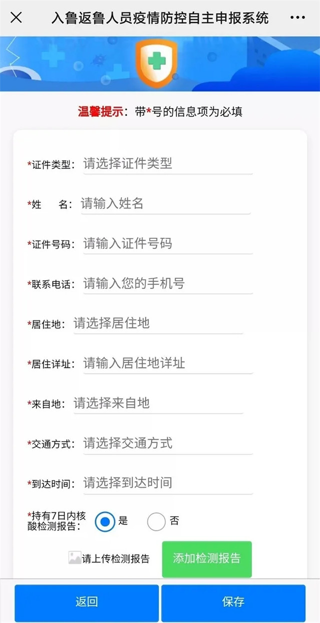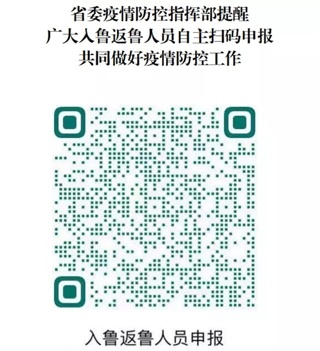 一、全面实行入鲁返鲁人员信息自主申报。根据当前“省外入鲁返鲁人员须持有7日内核酸检测阴性证明或进入我省后第一时间进行核酸检测”相关要求,省委领导小组(指挥部)紧急研发了“入鲁返鲁人员疫情防控自主申报系统” ,全面实行入鲁返鲁人员信息网上申报。各地要在所有交通场站、高速公路等出口,社区(村居)公共场所,宾馆、酒店、商场等人员密集场所广泛张贴 “入鲁返鲁人员自主申报”二维码,方便入鲁返鲁人员第一时间微信扫码或登录“爱山东”APP,主动申报出发地、目的地、核酸检测、联系方式等相关内容。系统将设置“自主申报端”和“随访登记端” , “自主申报端”主要用于入鲁返鲁人员个人申报和用工接待、宾馆饭店、社区(村居)等单位申报。“随访登记端” 主要用于基层社会随访工作人员日常排查、随访登记。联防联控与社会稳定组将对系统使用专门进行部署。