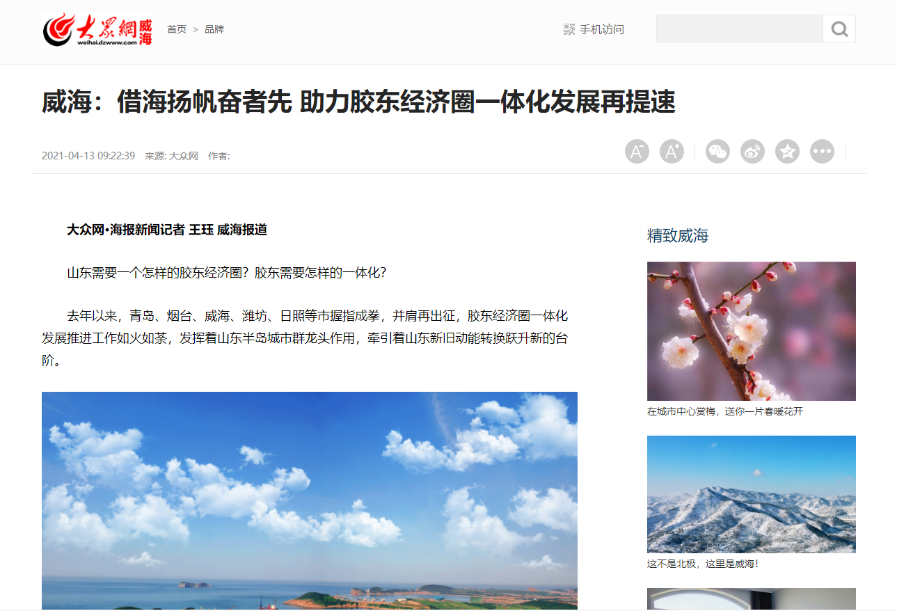 4月13日,大众网报道《威海:借海扬帆奋者先 助力胶东经济圈一体化发展再提速》,从产业群、海洋、交通、公共服务等方面,聚焦威海全面融入胶东经济圈一体化发展进程。以下为报道全文: