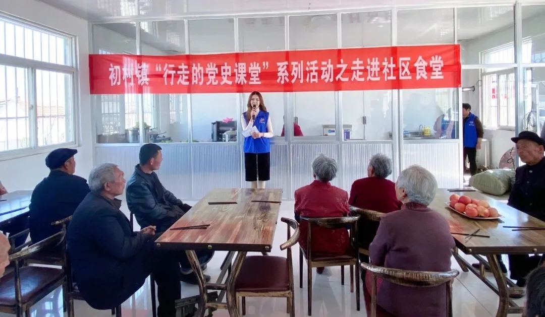 佃里院村幸福食堂是新时代文明实践的活动阵地,也是“志愿服务+信用积分”模式下的积极探索,如今食堂也成为了党史学习教育平台。今年是中国共产党成立100周年,为推动党史学习教育深入基层、深入群众,不断凝聚群众思想共识,坚定理想信念,初村镇解锁党史教育新模式,开设“行走的党史课堂”。