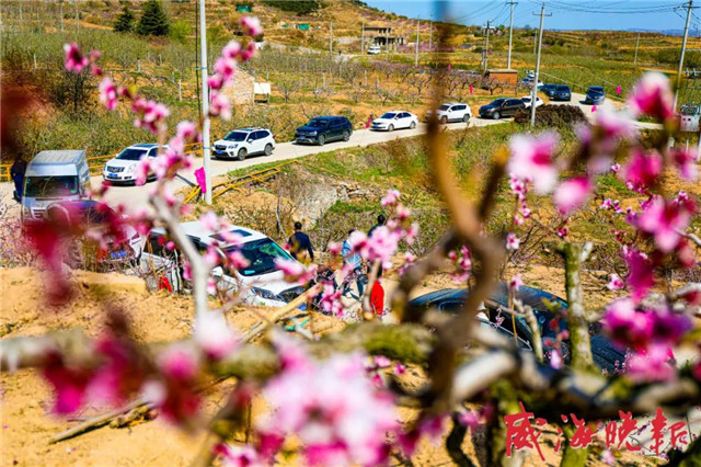眼下,威海市文登区葛家镇谭家口的万亩桃花竞相绽放,吸引了省内200余名自驾游游客观光“打卡”。 自驾游车队行进在桃林间的山路上,绯红的桃花迎着春风恣意开放,烂漫妩媚,姿态万千,映衬着起伏的山峦,美不胜收。