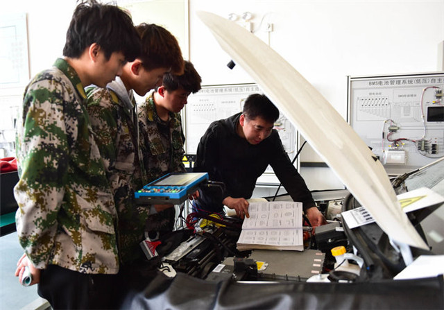 4月14日,在山西工程科技职业大学,老师正在指导学生进行新能源整车排故训练。