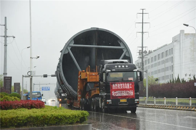 此次运输的大型装备是威海石岛重工为中石油某项目生产的大型塔型反应器,共4件,每件装车高度8.3米、宽7.9米、长21米,单体重量130吨。