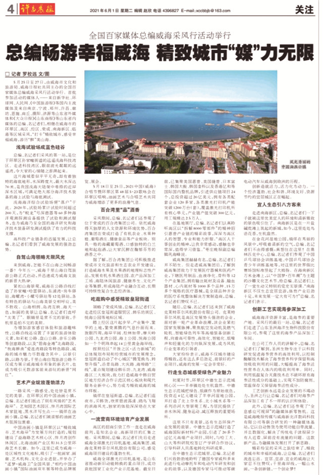 初夏的威海,碧波荡漾,花香满城。在5月25日至27日举行的全国百家媒体总编威海采风行活动中,来自新华社、环球网、人民网、《中国旅游报》等国内主流媒体及来自南京、宁波、郑州、许昌、廊坊、恩施、商丘、濮阳、济源等省外媒体和《大众日报》《山东商报》等省内媒体的总编、名记者齐聚威海。欣赏着山海美景,参观着产业项目,感受着精致城市建设,总编、名记者们对威海发出由衷的赞美。