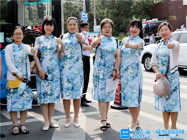6月7日,记者在市直考区威海一中东、西校区及威海二中南校区考点外看到,陪考队伍中不少女性家长穿上红色或其他鲜艳色彩的旗袍,而一些男教师则穿上了红色T恤。一名教师表示,为给考生讨个好彩头,学校特意为送考女教师统一选购了旗袍,以祝福考生旗开得胜,为送考男教师统一选购红色短袖,寓意考生鸿运当头,另外红色短袖上有对勾标志,寄托对考生的美好祝愿。