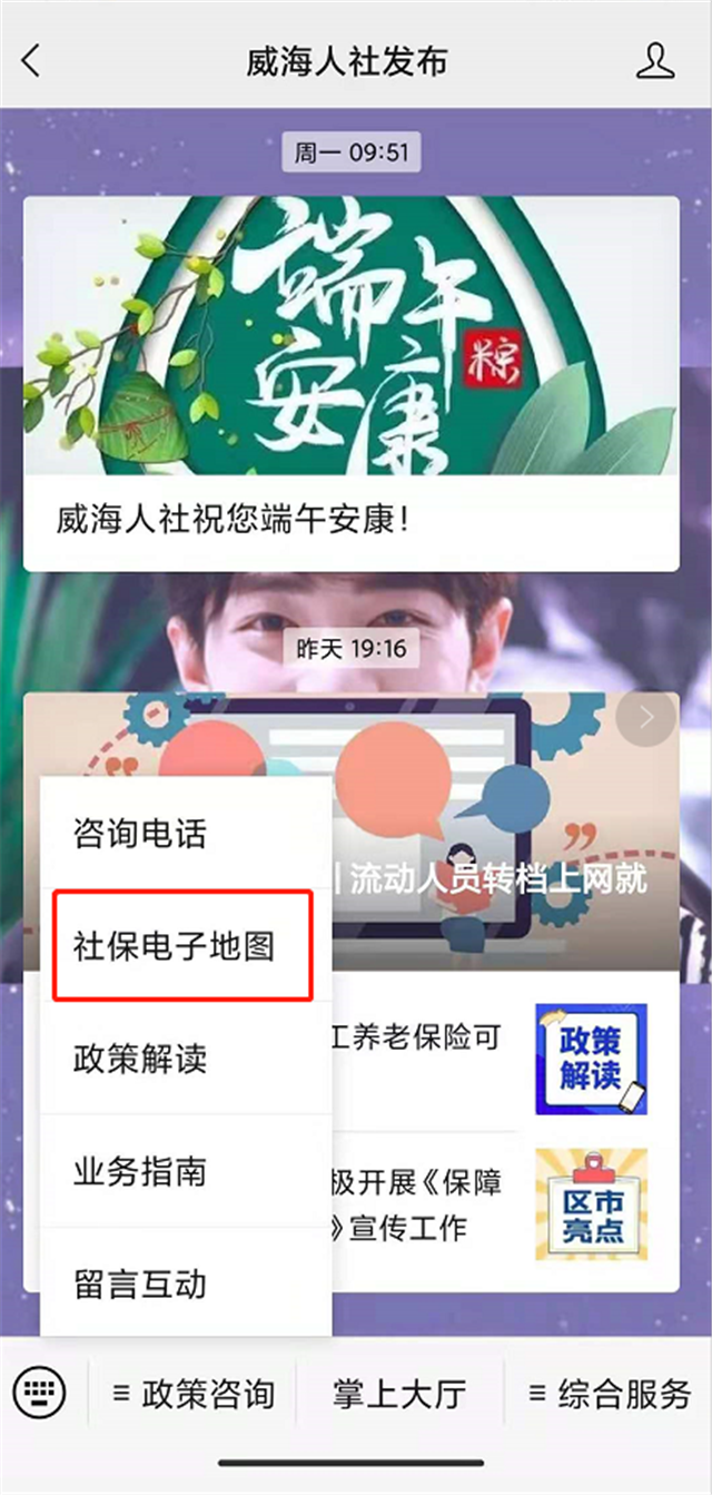 如果想了解附近哪里可以办社保业务,打开手机,进入“威海人社发布”微信公众号,点击最下方导航栏“政策咨询”,就可以找到“社保电子地图”专栏。