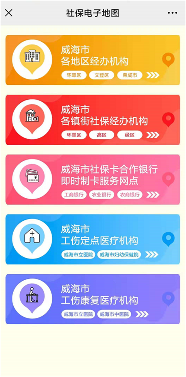 威海版“社保电子地图”分为威海市各地区经办机构、威海市各镇街社保经办机构、威海市社保卡合作银行即时制卡服务网点、威海市工伤定点医疗机构以及威海市工伤康复医疗机构等五大板块,可实时查询我市8家市区两级社保经办机构、73家各镇街社保所、22家社保卡合作银行即时制卡服务网点、17家工伤定点以及6家工伤康复医疗机构所在位置及联系方式。办事对象可在手机移动端实时检索网点、查询地点,实现了我市区域内社保经办服务网点一键可查、精确导航、就近到达的目的。