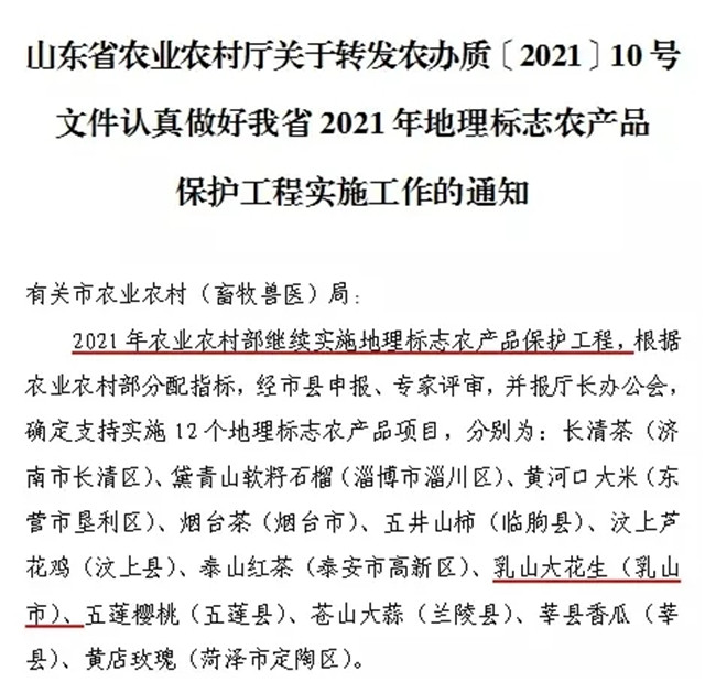 6月23日,山东省农业农村厅印发了《关于转发农办质〔2021〕10号文件认真做好我省2021年地理标志农产品保护工程实施工作的通知》,全省12个地理标志农产品将实施2021农业农村部地理标志农产品保护工程,“乳山大花生”成功入围。