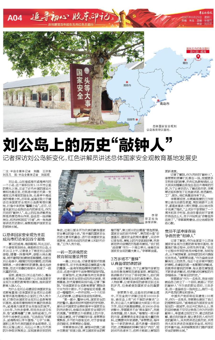 刘公岛,山东省威海市威海湾内的一个小岛,这个面积仅有3.15平方公里的弹丸之地,见证了近代中国的国运兴衰和沧桑巨变。它既是中国近代第一支海军北洋海军的诞生地,也是甲午海战英烈埋骨之所。近年来,威海正致力于建设总体国家安全观刘公岛教育培训基地,打造中华民族“警醒之岛”。近日,半岛记者来到刘公岛探访岛内的新变化,作为历史的“敲钟人”,岛上的红色讲解员发挥党员模范带头作用,奋战在一线讲解岗位,把历史和现实“打通”,向一批批游客讲述历史教训,凝聚起维护国家安全的钢铁长城。