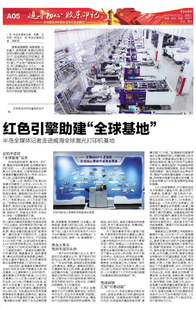 集聚美国惠普、美国捷普、日本富士、联想图像、香港亿和等国际国内整机品牌,引进供应链项目24个、总投资超过20亿美元,各类激光打印机产能突破1200万台(套),产业链产值突破300亿元,用工规模达到2.5万人……威海全球激光打印机基地的蓬勃发展,离不开威海高新区党员干部的担当作为、进取专业、执着拼命,也离不开激光打印机产业链条党组织的战斗堡垒作用。近日,半岛记者走进威海全球激光打印机基地,探访“在危机中求生存,在生存中谋发展”背后的故事。