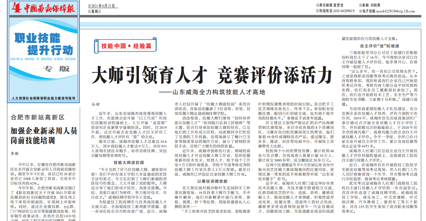 近日,《中国劳动保障报》聚焦威海市在培养技能人才方面所做工作,发表题为《大师引领育人才 竞赛评价添活力——山东威海全力构筑技能人才高地》的文章,以下为报道全文: