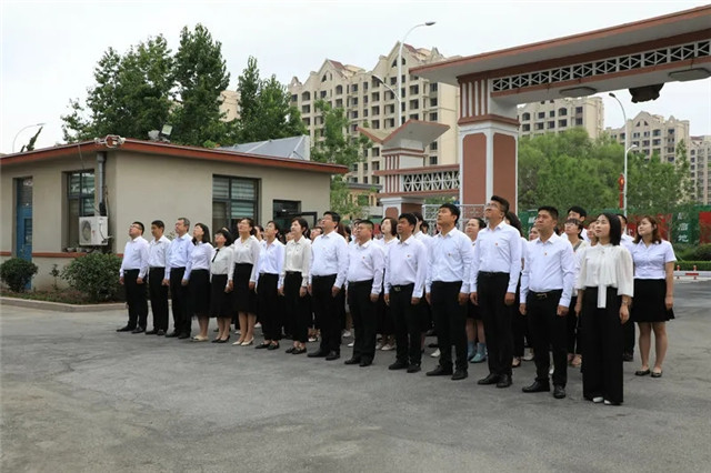 伴随着庄严的国歌声,鲜艳的五星红旗冉冉升起,全体党员干部深怀对祖国的崇高敬意,端庄肃立,向鲜艳的五星红旗行注目礼,并跟随旋律齐唱国歌,向伟大祖国表达最诚挚的热爱和最美好的祝愿。