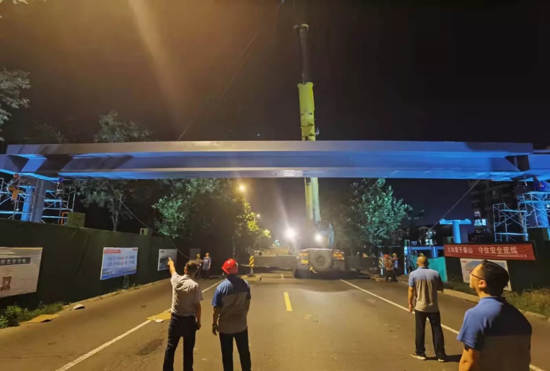 7月21日晚,备受市民关注的环山路—佛顶山路过街天桥主体钢梁成功吊装完成。