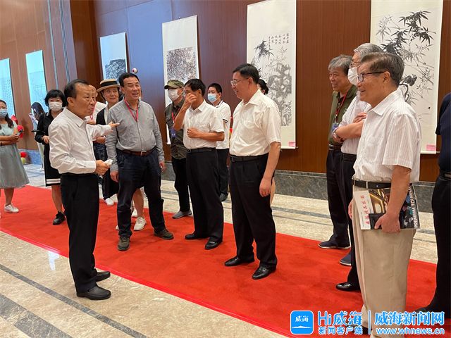 当天的书画展吸引了不少与会人员驻足观看,一幅幅精彩的国画,或山水、或人物、或飞禽走兽均栩栩如生,各具特色。据介绍,此次书画展主题为“百佳书画作品·庆祝建党百年”山东省旅游书画院书画作品威海巡展。本次展览共展出书画作品100幅,作品主题鲜明,形式丰富,涵盖了绘画书法两大领域。“这场书画展回顾了中国共产党艰苦卓越的创业历程,旨在讲好山东故事,弘扬齐鲁文化,展现山东新旧动能转换结果,从不同角度讴歌党的百年丰功伟绩和人民安居乐业的美好生活,具有强烈的时代性,观赏性和艺术性。”张剑介绍。