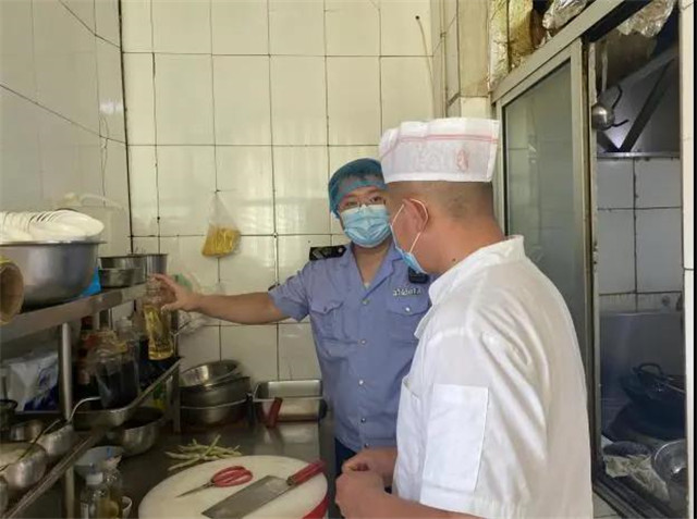 “保鲜柜和冰柜中的原材料一定要做到分区分类存放,现在你们生、熟食品混放,成品与半成品混放,大大增加了原材料交叉污染的风险。”执法人员在检查后厨的食品加工、环境卫生、工作人员着装情况时指出。