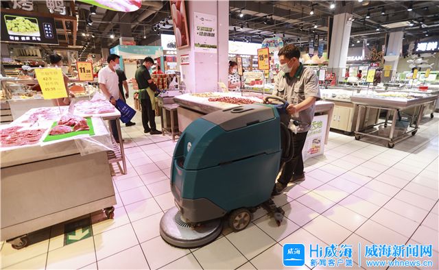 超市内,一名保洁人员正使用扫地器给地面消毒。“这里加了84消毒液,除了每天定时的四次彻底消毒通风外,一楼食品区域地面随时消毒、随时清洁。”王静介绍,超市对购物车筐、收银机、电子秤、自动扶梯、服务台等设备器具每天消毒;在岗的每位员工都要求戴口罩、勤洗手,使用消毒液、酒精等,做好个人防护。