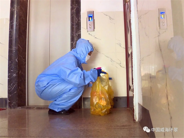 穿上严密的防护服,戴上手套,随身携带酒精喷雾器……这一身“专业”打扮,在环翠区祥云花园小区居民看来已经见怪不怪,这是物业工作人员在为居家隔离和居家健康监测人员回收生活垃圾和口罩。