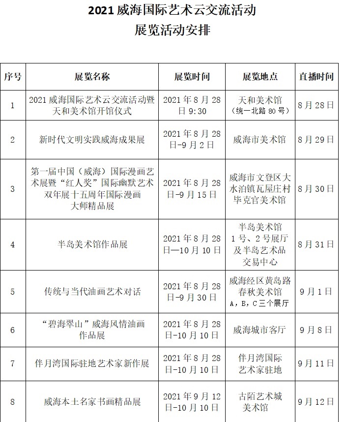 8月28日,2021威海国际艺术云交流活动正式开幕。此次活动是我市首次举办的以线上直播为主的综合性艺术交流活动,历时一个半月,采用全城联展模式,在17个不同展馆展出。展览汇集了国内外艺术名家以及我市本土艺术家的大批精品力作、精美收藏,涵盖了油画、水墨、水彩、雕塑等众多艺术门类,设置了开幕主题展和22项艺术展览。