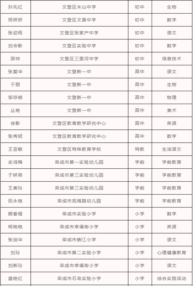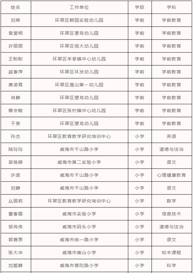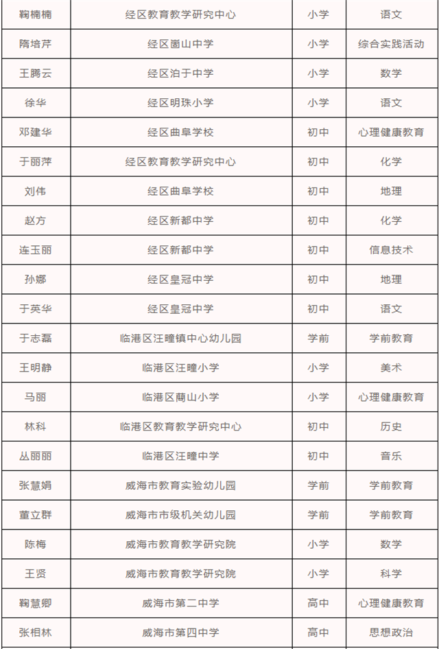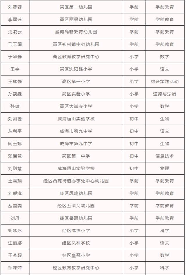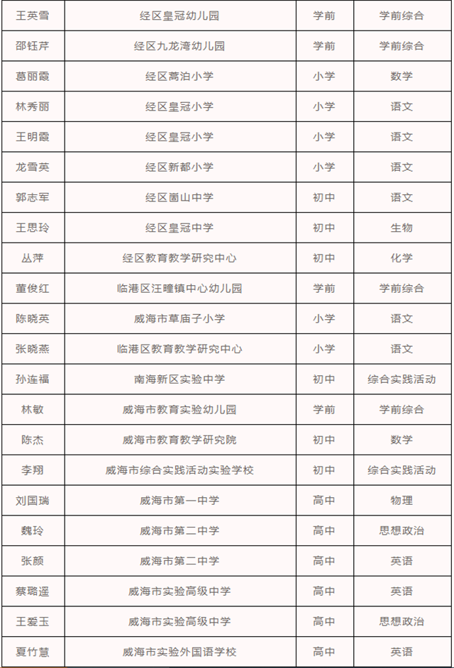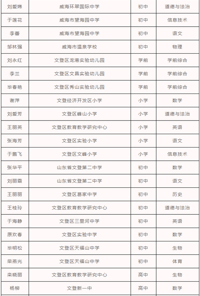 9月10日是我国第37个教师节,为表扬先进事迹弘扬师德新风,市委宣传部、市教育局评选出了“2021年度威海最美教师”“威海市教书育人楷模”“威海市师德建设先进集体”“威海市师德标兵”“威海首批教师志愿服务品牌团队”“威海市第十三届教学能手”“威海市第八届学科带头人”等先进典型,引导广大教师提高师德修养和业务素质,为办好人民满意教育作出更大的贡献。具体名单如下: