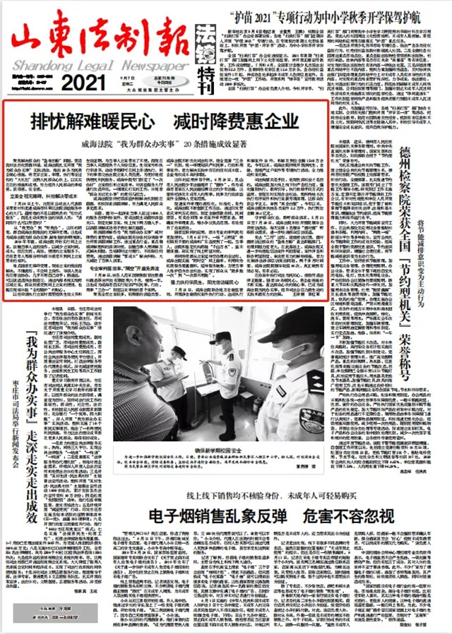 近日,《山东法制报》头版头条发布《排忧解难暖民心 减时降费惠企业——威海法院“我为群众办实事”20条措施成效显著》一文,点赞威海中院为民惠企“暖心措施”。