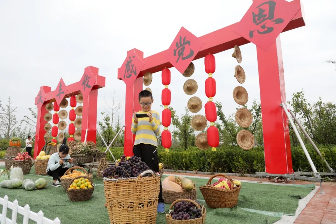 在活动现场的丰收墙区,特别设置了一面“庆丰收 感党恩 ”丰收墙,一筐筐、一篮篮果蔬现场摆陈,供游客们拍照“打卡”,好不热闹。“太喜欢这种收获的感觉了,你看,葡萄、玉米、地瓜、冬瓜、苹果、桃子,满眼都是,仿佛回到了小时候,都是天然朴实的味道,今天特意带着4岁的女儿来参加活动,给她的童年留下不一样的记录。”正在丰收墙打卡拍照的游客肖女士感慨地说。