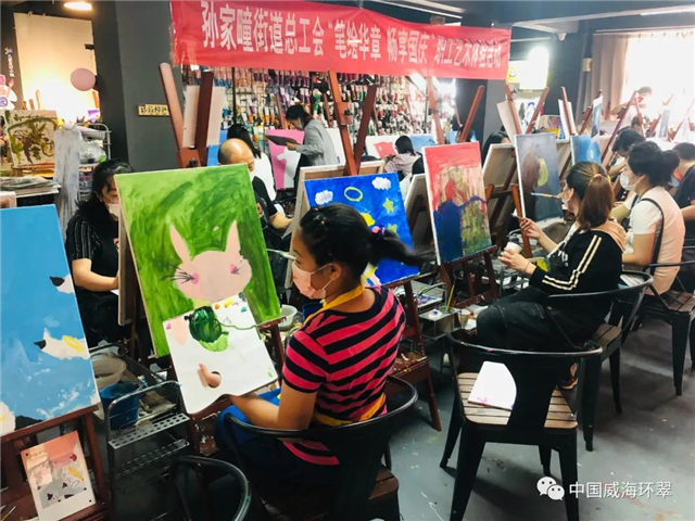 在半月湾街区,“笔绘华章 畅享国庆”创意艺术体验活动人气很旺,大人、孩子,一人一个画架,一人一幅作品,手持画笔、轻涂慢抹,在这里,你——就是“艺术家”。