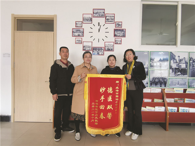 10月21日上午,南海新区蓝湖街道凤鸣港社区居民张先生、于女士夫妇,特意赶到经开区蒿泊小学,在学校负责人的见证下,将一面锦旗送到校医于晓文手中,感谢她见义勇为,关键时刻救了他们的父亲一命。