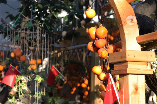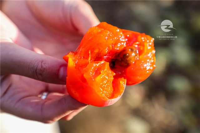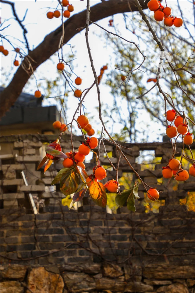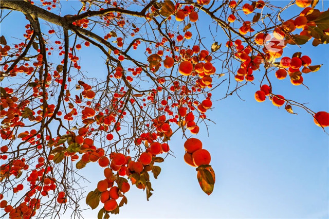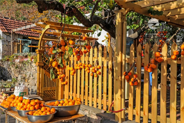 里口山家家户户都种有柿子树,树龄高达百年,走在乡间小路上,艳丽的橘红夹道作声,粗壮笔直而又苍古的柿子树傲然耸立。