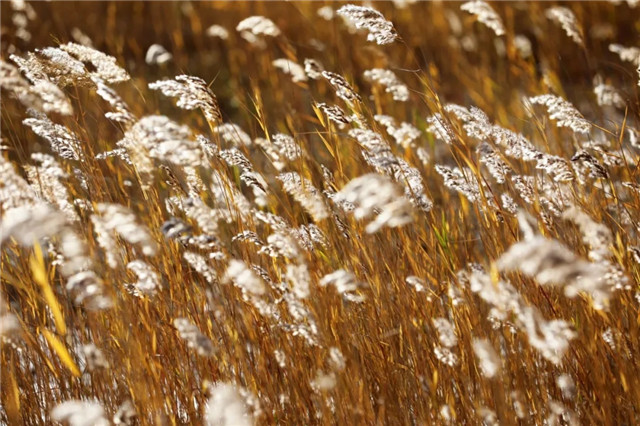 秋风绕过几条街巷,扫尽满地落叶,又吹得一池芦苇半池雪。一穗穗清新素雅的芦苇花随风摇曳,在阳光里染得一身金黄,营造出一个诗意盎然的世界。