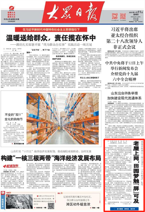 11月11日,《大众日报》头版刊发《环翠区上线全省首个“乡村找房”APP 老屋上网,田园梦触“屏”可及》一文,聚焦威海市环翠区开发“乡村找房”APP,实现了农村老屋上网,让城里人的田园梦触“屏”可及。以下为报道全文——