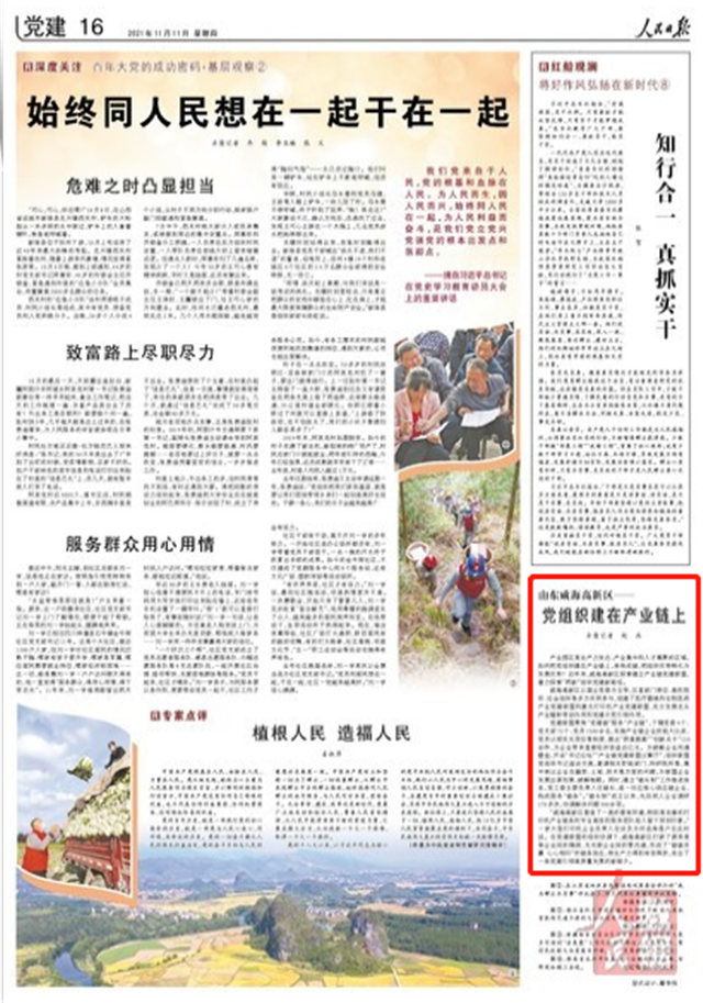 11月11日,《人民日报》刊发《山东威海高新区——党组织建在产业链上》一文,聚焦威海高新区探索建立产业链党建联盟,着力探索“两新”组织党建新路径,以下为报道全文——