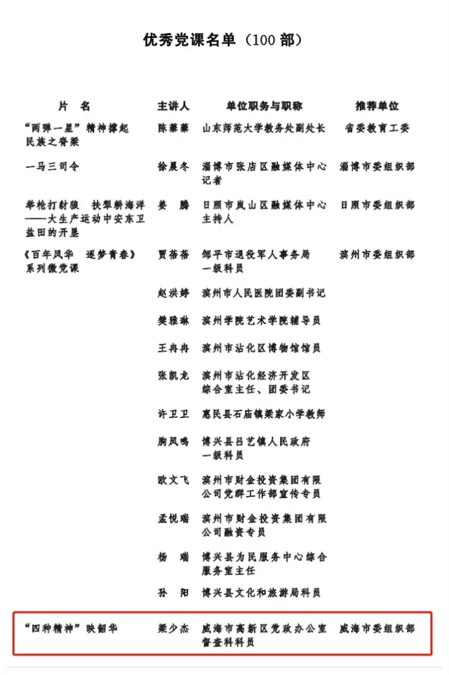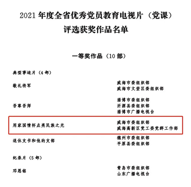 为表彰先进、推动工作,山东省委组织部组织开展了2021年度全省优秀党员教育电视片(党课)评选工作。经初审把关、专家评审和观摩互评,共评选出100部获奖电视片、100部优秀党课。其中,威海市高新区报送的光威集团创始人陈光威典型事迹片《用家国情怀点亮民族之光》荣获全省一等奖,《“四种精神”映韶华》被评为全省100部优秀党课。
