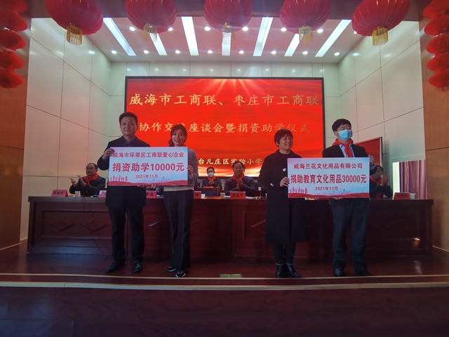 兰花文化用品许培文、瑞纳进出口吕文娜代表环翠区工商联爱心企业家共为台儿庄实验小学捐赠文化用品及资助贫困学生,价值4万多元,受到师生一致欢迎。建美科技、众志军创等企业就捐赠智慧食堂设备、采购当地农副产品助力乡村振兴等事宜,与枣庄市工商联达成了初步合作意向。