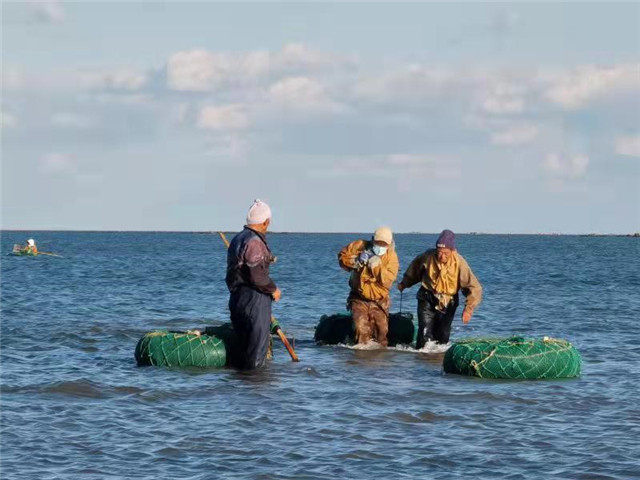 入冬之际,天气转凉。荣成崂山街道崂山屯村集体经济还处在繁忙期,在崂山屯村的海区,可以看到两幅不一样的集体经济运作图。一边干得热火朝天的十几个挖蛏人,手持盐瓶、铁锹、篮子熟练地收获着沙下的蛏子;另一边多辆铲车从海里运出一车车蛤蜊,随后经过卸货、筛选、洗净、装车被运往了各大海鲜市场售卖。