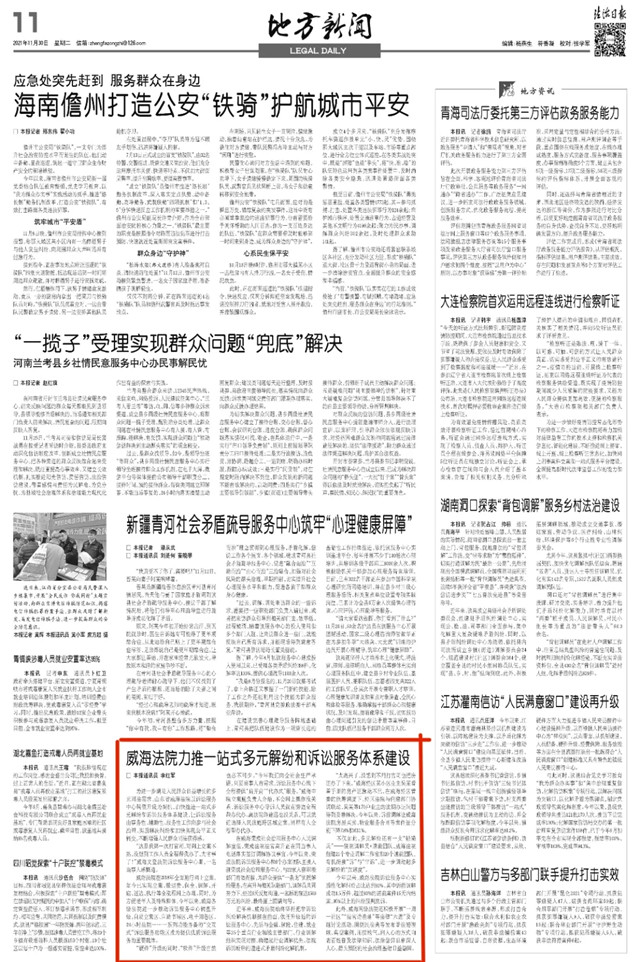 近日《法治日报》发布《威海法院力推一站式多元解纷和诉讼服务体系建设》一文,报道威海法院一站式多元解纷和诉讼服务体系建设情况。以下为报道全文: