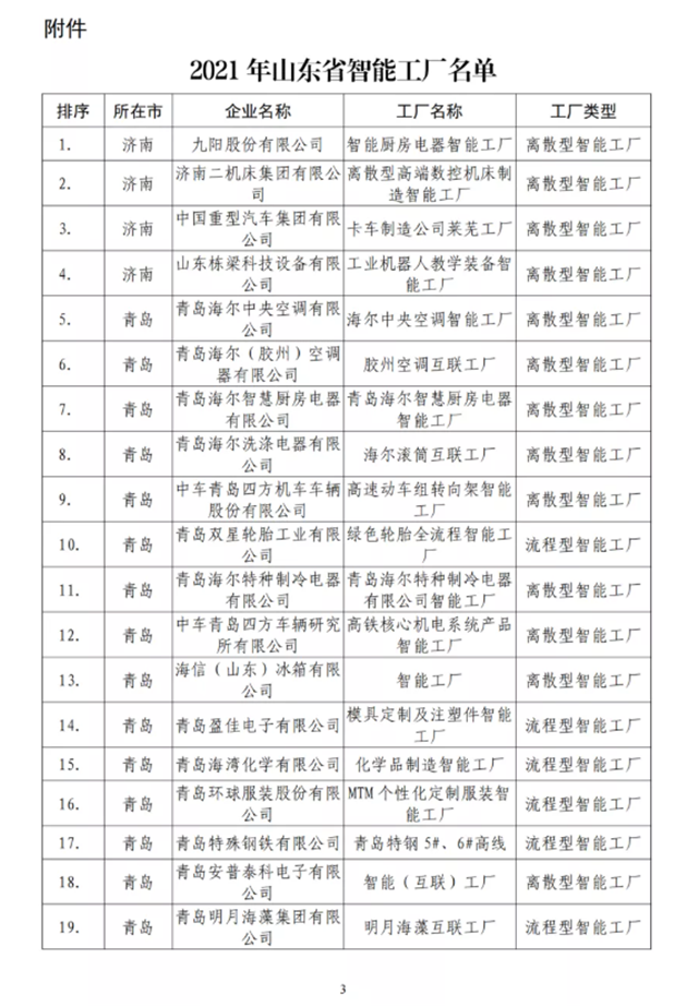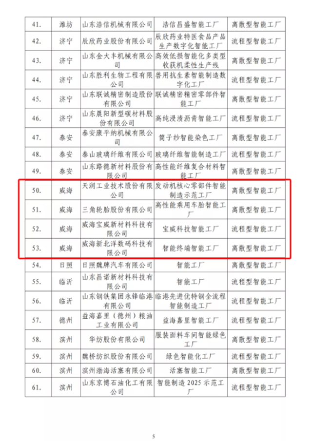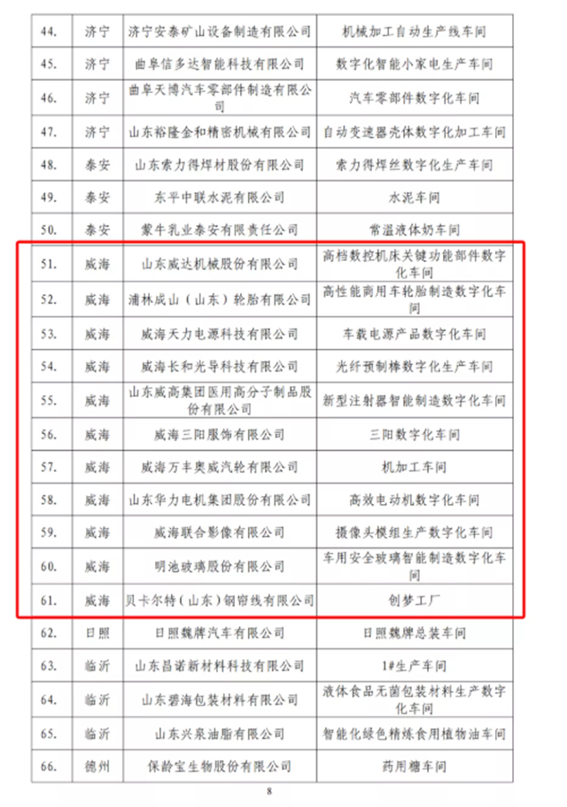 近日,省工信厅印发《关于公布2021年山东省智能工厂和数字化车间名单的通知》,我市威海宝威新材料科技有限公司等15家企业入选,占全省总量的10.5%,入选数量位居全省第三位。其中,山东威达机械股份有限公司等11家企业入选省级数字化车间,占全省总量的13.4%,与潍坊市并列全省第一位。