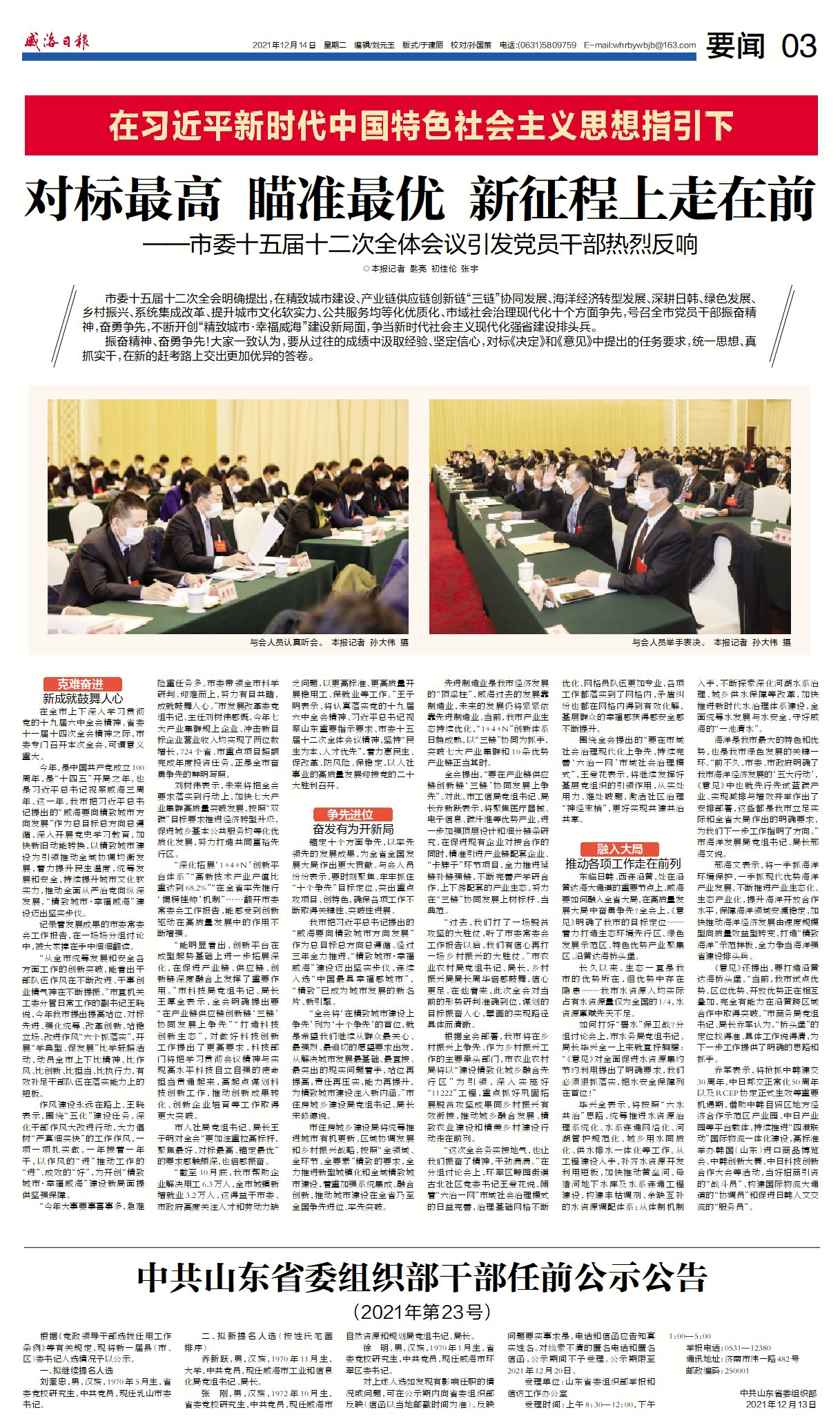 中国共产党威海市第十六届委员会第九次全体会议举行