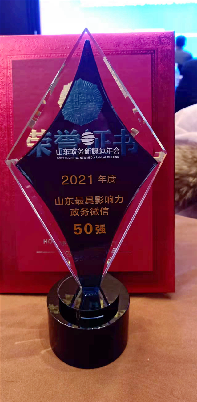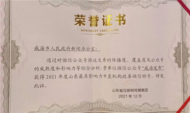 此外,中国荣成荣获2021年度山东最具影响力政务微信50强、2021年度山东最具影响力县级政务微信称号,文登发布荣获2021年度山东最具影响力县级政务微信称号,威海警方在线荣获2021年度山东最具影响力市直机构政务微信称号。