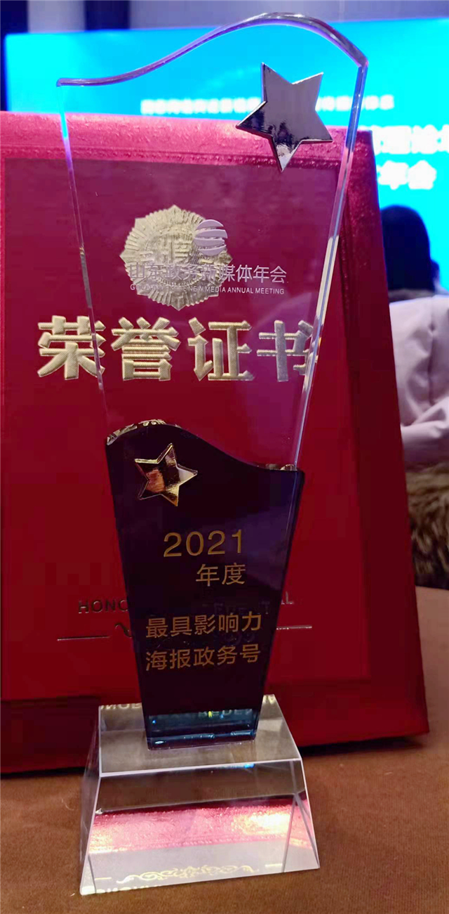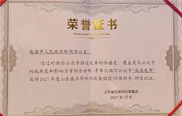 “威海发布”荣获2021年度山东最具影响力政务微信50强、2021年度山东最具影响力市直机构政务微信、2021年度最具影响力海报政务号称号。