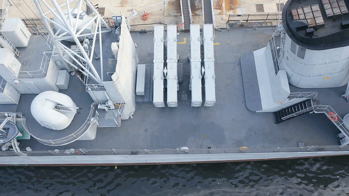 从舷梯登上舰艇,可以看到主炮、副炮、反舰导弹发射架、雷达、舰空导弹……所有装备与整个舰体有机融为一体。