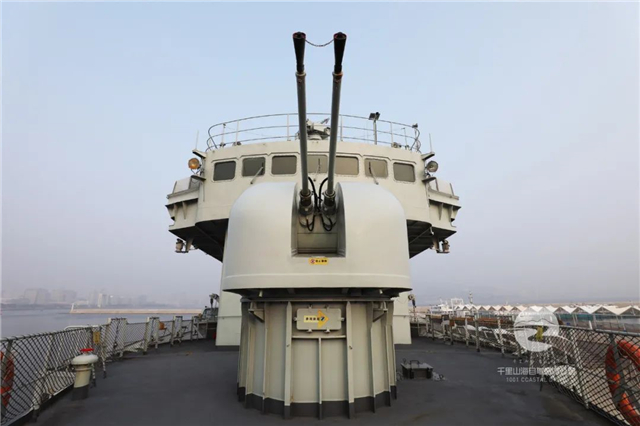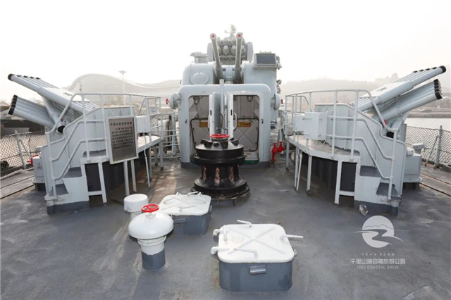 往上走到艏楼二层平台,可看到驱逐舰的副炮,双管37毫米舰炮,简称“三七炮”,整座舰艇上一共装有三座。