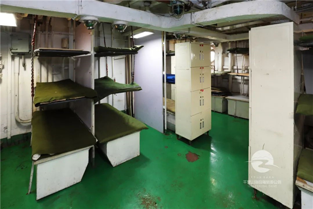 来到主甲板下一层的士兵仓,可见床铺上、中、下有序排列,一个小小的士兵仓,可容纳30-40名官兵居住。在墙上,三排不同数量的圆点十分引人注意。