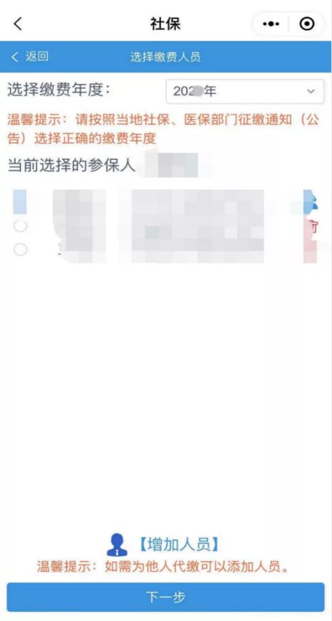 第三步:右上角选择缴费年度(2022),选择参保人(第一次需用“增加人员”添加人员信息),然后下一步;