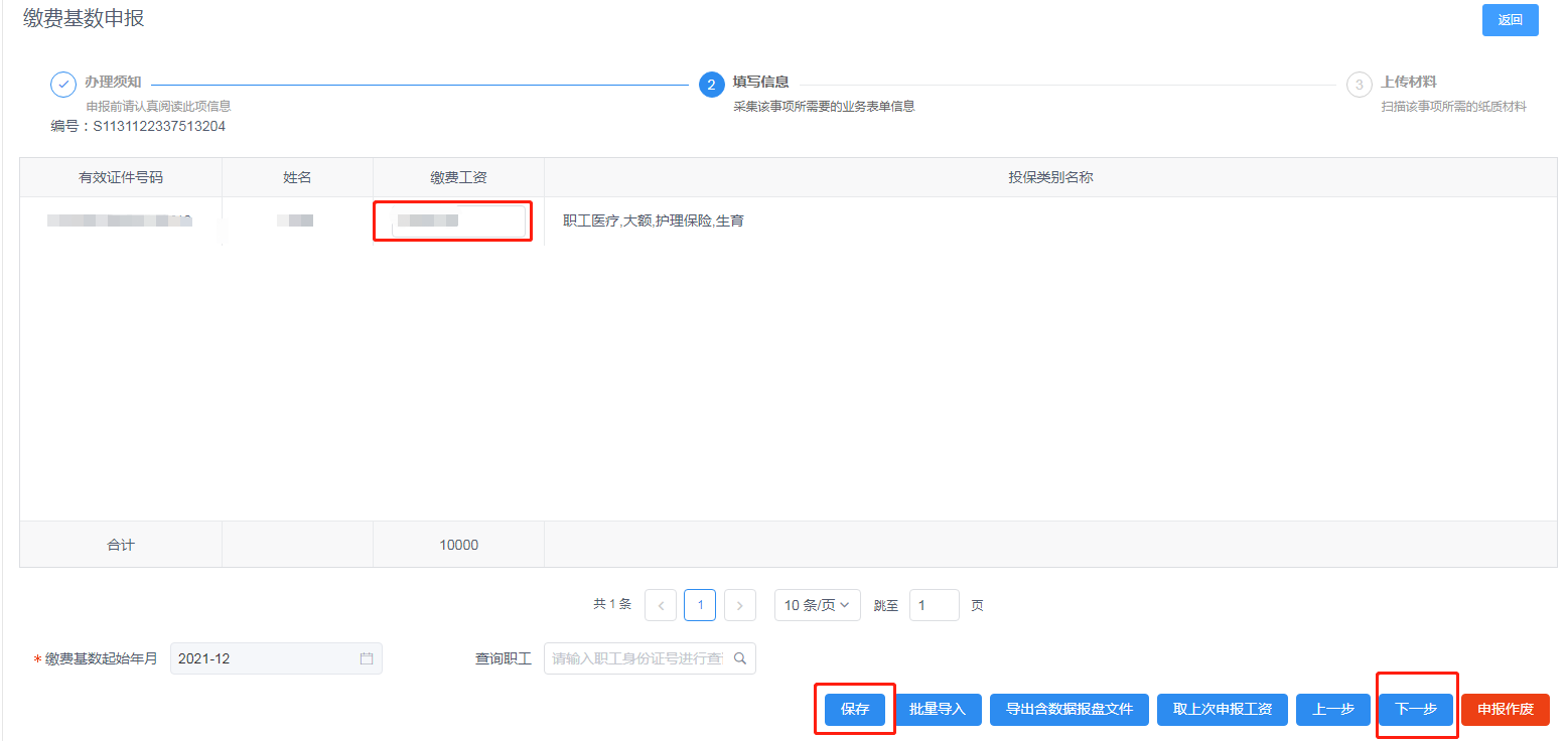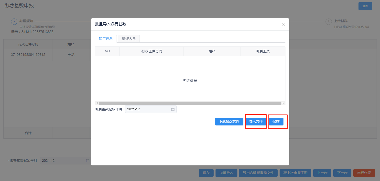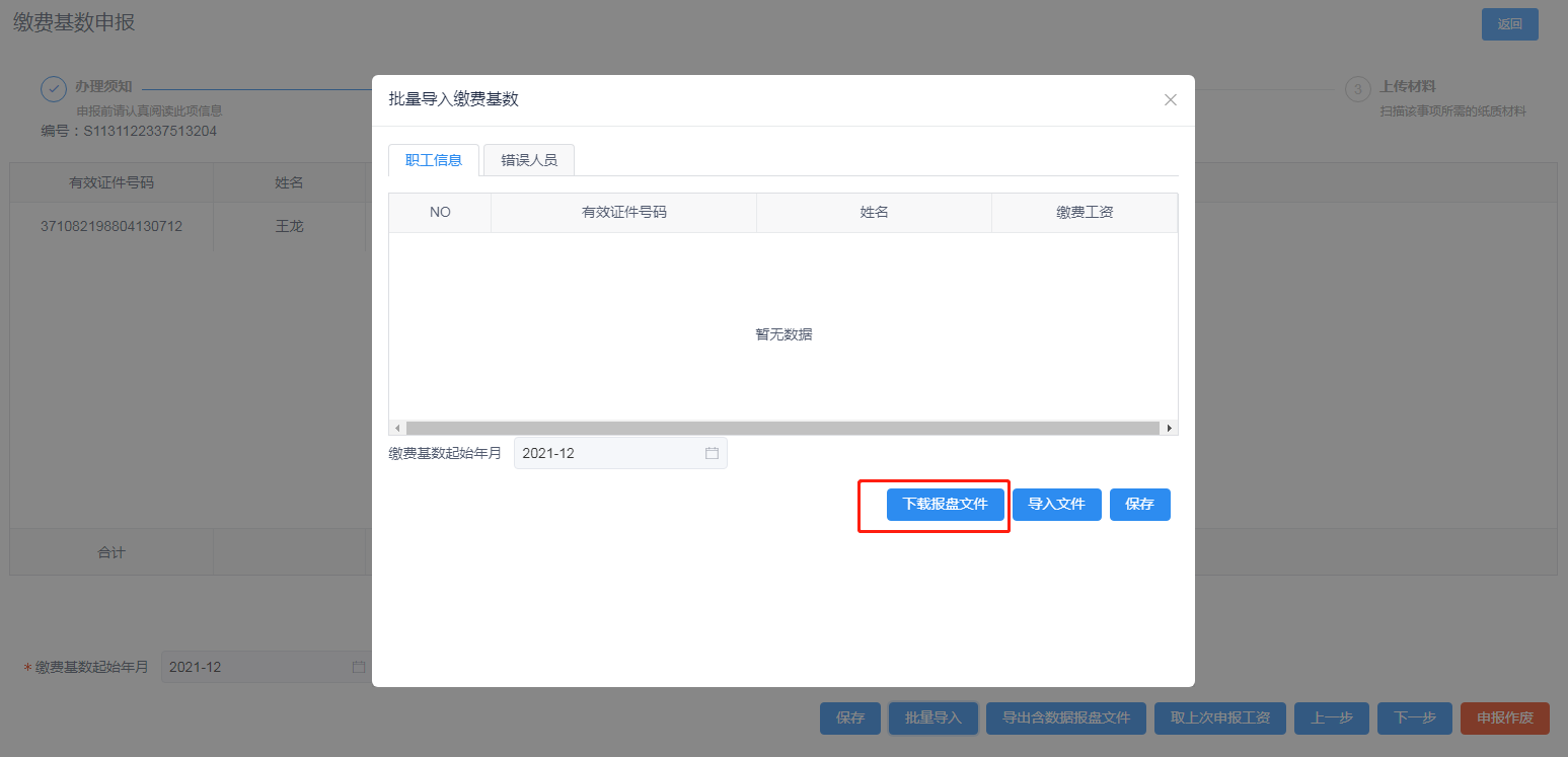 4.点击“批量导入”,下载报盘文件,批量录入职工缴费基数后,导入文件,保存,或着手工录入缴费基数,保存,点击“下一步”。