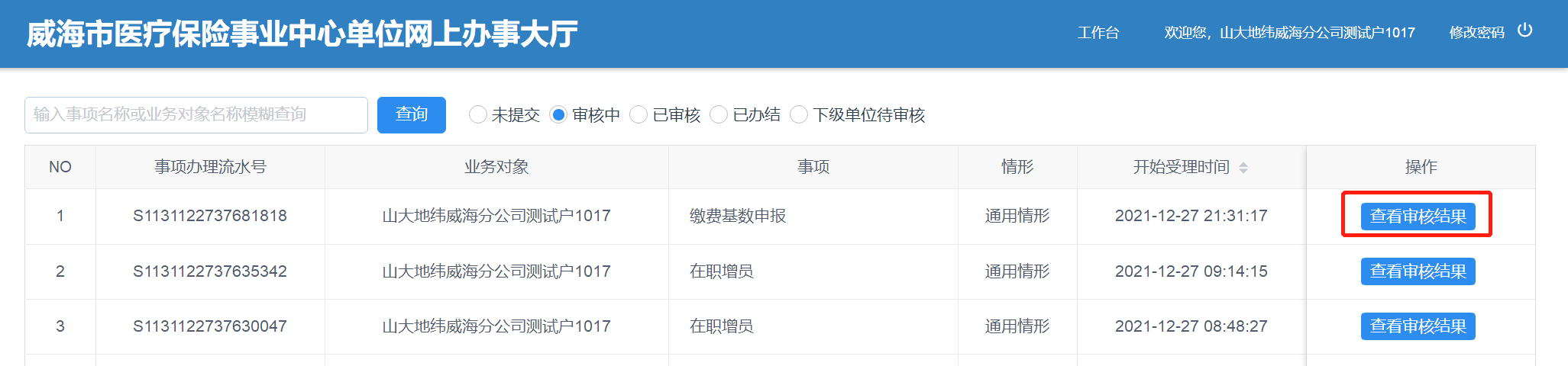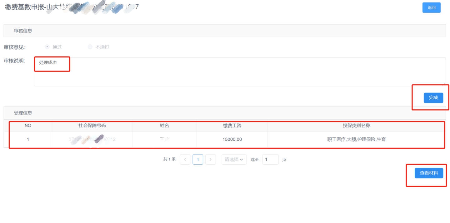8.提交后,企业即可查看审核结果,核对受理信息姓名、缴费工资准确无误后,点击“完成”。