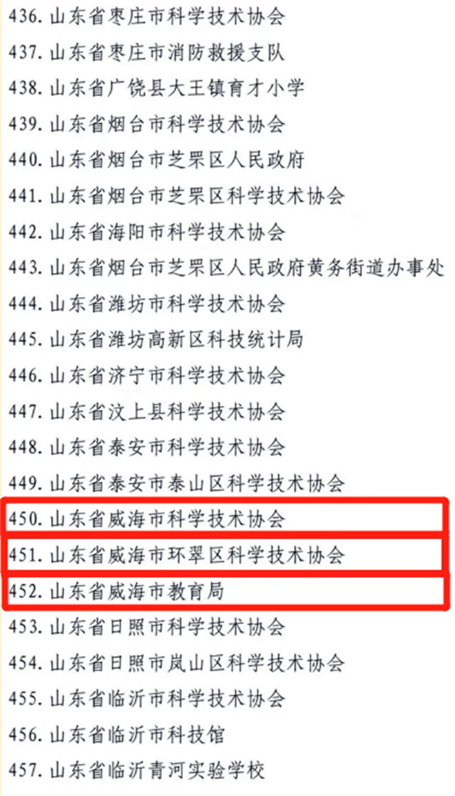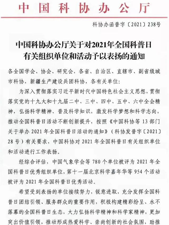 近日,中国科协公布了2021年全国科普日活动考核结果。其中,威海市有三家被评为2021年全国科普日优秀组织单位,分别是威海市科学技术协会、环翠区科学技术协会以及威海市教育局。