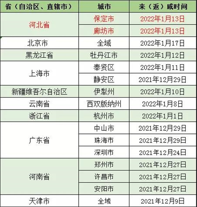 自保定市、廊坊市、牡丹江市、上海市(奉贤区、静安区)、郑州市、许昌市、安阳市、北京市(全域)、伊犁州、西双版纳州、杭州市、中山市、珠海市、深圳市、天津市(全域)等发生本土疫情地区的入(返)威人员,与已公布的阳性感染者活动时空轨迹重叠人员,到过或途经中高风险地区人员,请第一时间主动向所在社区(村)、住宿宾馆和单位报备,配合落实属地疫情防控指挥部管控措施和相应核酸检测要求。