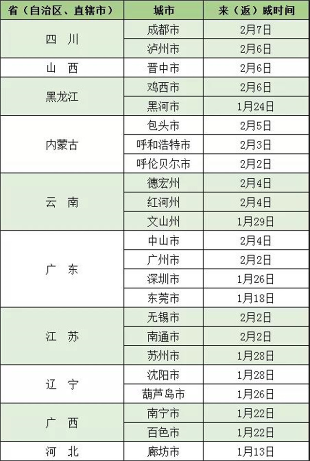 自成都市、泸州市、晋中市、鸡西市、包头市、德宏州、红河州、中山市、呼和浩特市、呼伦贝尔市、无锡市、南通市、广州市、苏州市、文山州、沈阳市、葫芦岛市 、南宁市、百色市、黑河市、深圳市、东莞市、廊坊市等发生本土疫情地区的入(返)威人员,与已公布的阳性感染者活动时空轨迹重叠人员,到过或途经中高风险地区人员,请第一时间主动向所在社区(村)、住宿宾馆和单位报备,配合落实属地疫情防控指挥部管控措施和相应核酸检测要求。
