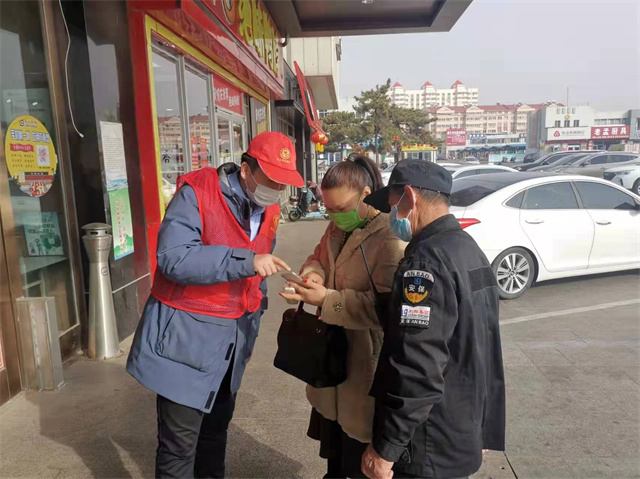 活动中,乳山市商务局志愿服务队在市区各商场超市守好入口关,为顾客测量体温、查验三码,检查口罩佩戴情况,并为未戴口罩的居民免费发放口罩,引导老人下载和使用健康码,指导帮助没有智能手机的群众完成信息登记。