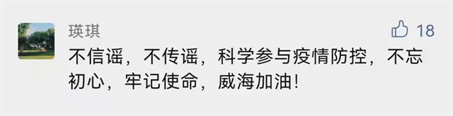 真的想给威海人点一个大大的赞,疫情面前没有恐慌和混乱,每一个人都表现得格外客观、理性和善良,乐观和豁达,就像网友说的那样:疫情面前,没有人是旁观者,每个人都是责任人。